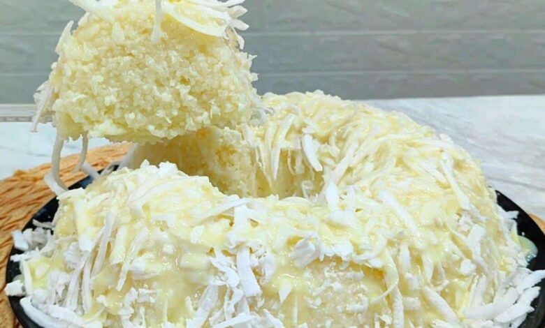 - Retire da geladeira, desenforme em uma travessa, polvilhe coco fresco ralado e regue com leite condensado a gosto.