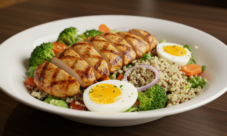 Uma excelente opção para quem deseja praticidade e alto valor nutricional é a salada proteica com frango grelhado, ovo e grãos.